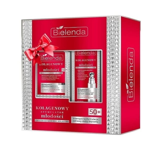 Склад набору: Крем проти зморшок, що підтягує і відновлює - Bielenda Collagen Youth Stimulator Cream 50+, 50 мл + Розгладжуючий і підтягуючий крем проти зморшок під очима і навколо рота - Bielenda Collagen Youth Stimulator Eye Cream, 15 мл